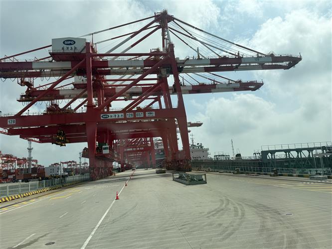 在工作人员的引导下,大家乘坐大巴车深入码头作业现场,了解到,码头装卸作业采用“远程操控双小车桥吊+自动导引车+全自动轨道吊”的生产工艺,主要由码头装卸、水平运输、堆场装卸的自动化装卸设备及自动化码头生产管控系统构成。操控人员在控制室通过远程操作台控制和监管位于作业现场的桥吊和轨道吊,极大改善操控人员的劳动环境,降低劳动强度。